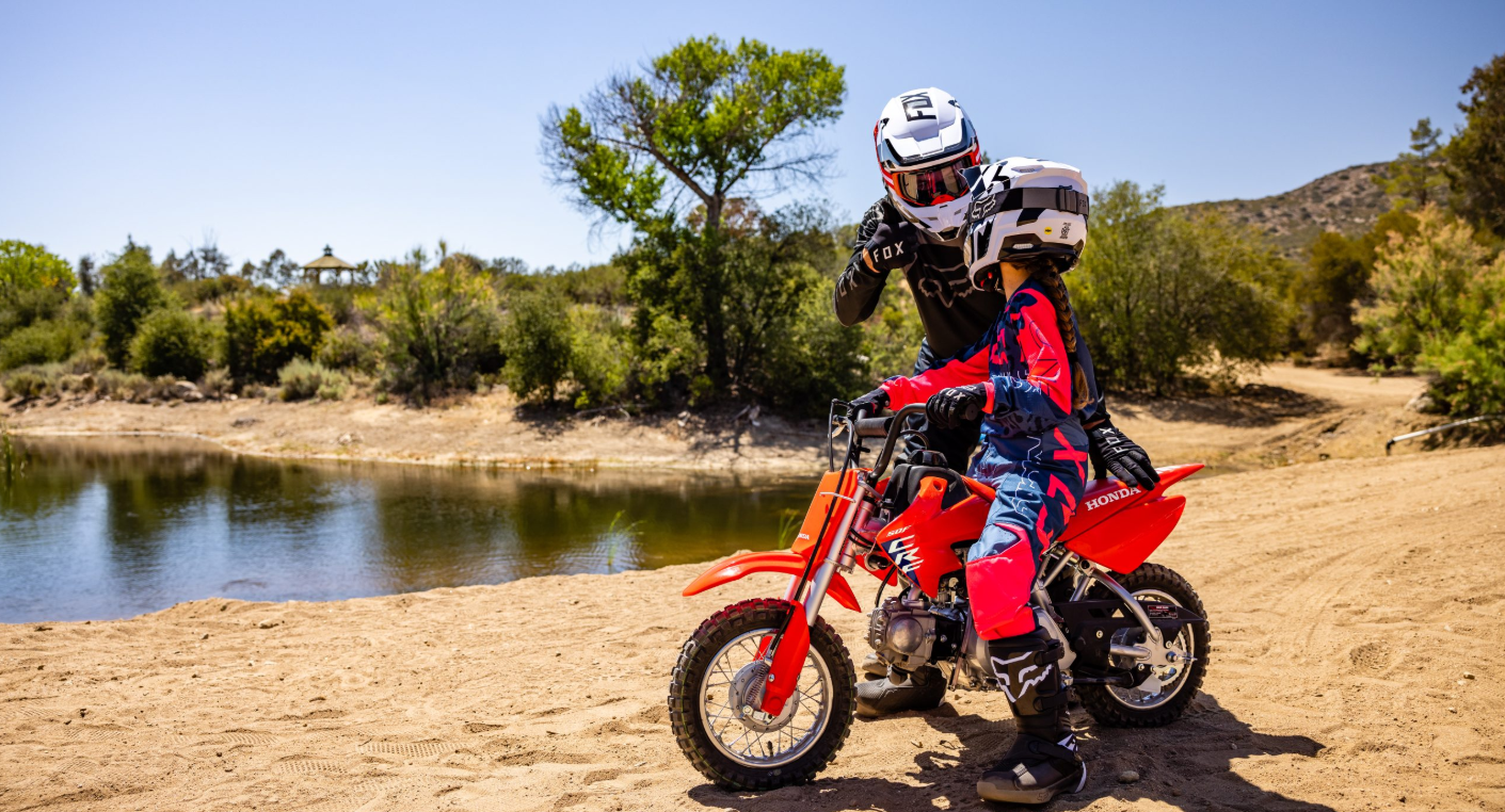 Honda CRF50F är den perfekta nybörjarhojen för barn som vill prova på motocross. Den lilla maskinen har en körglad och driftsäker luftkyld fyrtaktsmotor på 49 kubik med praktisk automatkoppling som underlättar att komma igång med körningen. Nybörjare brukar också känna sig trygga med de små 10-tumshjulen och den låga sadelhöjden. Till 2023 uppdateras CRF110F med färgsättning och dekaler från storasyskonen CRF250R och CRF450R.
